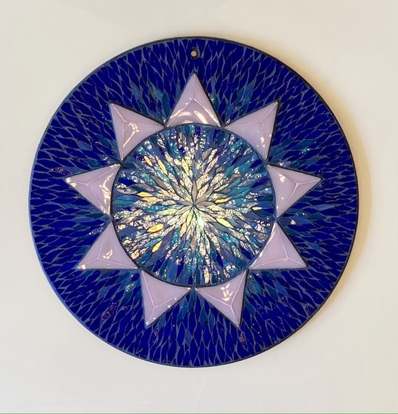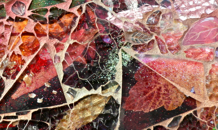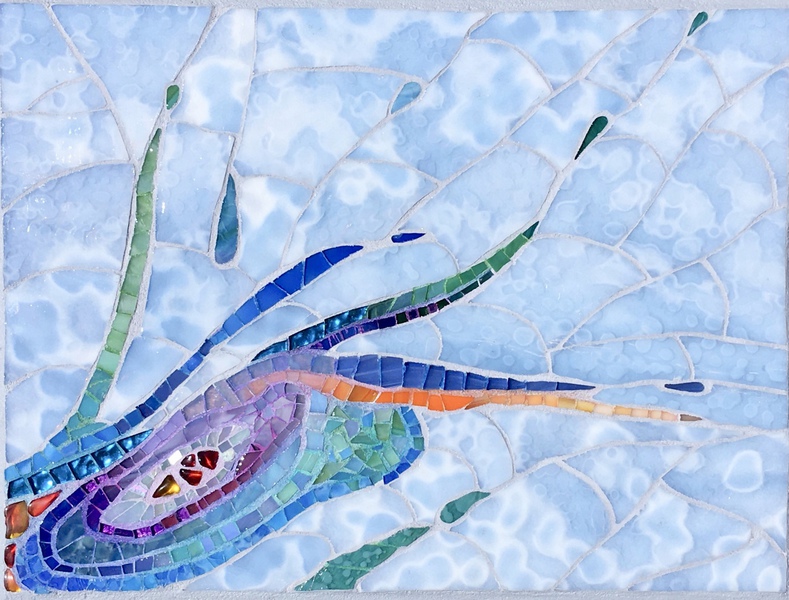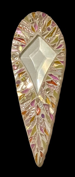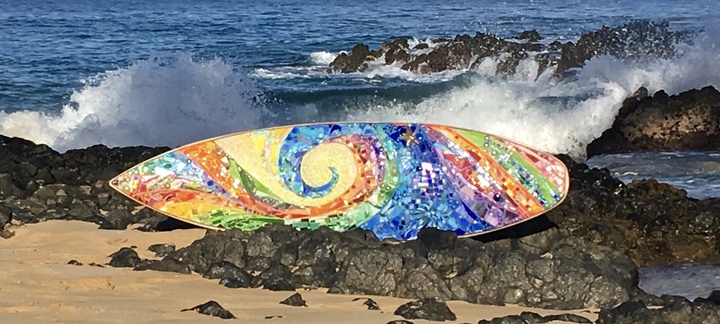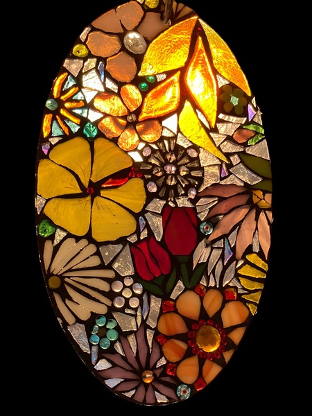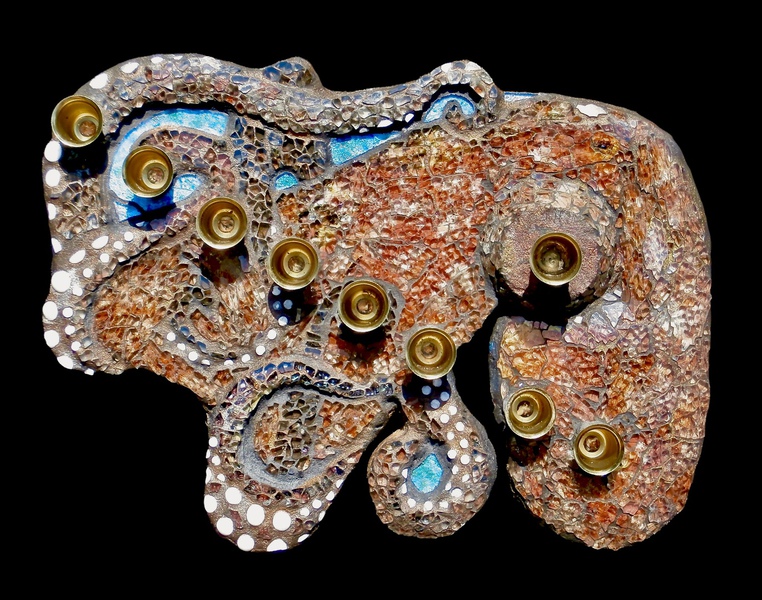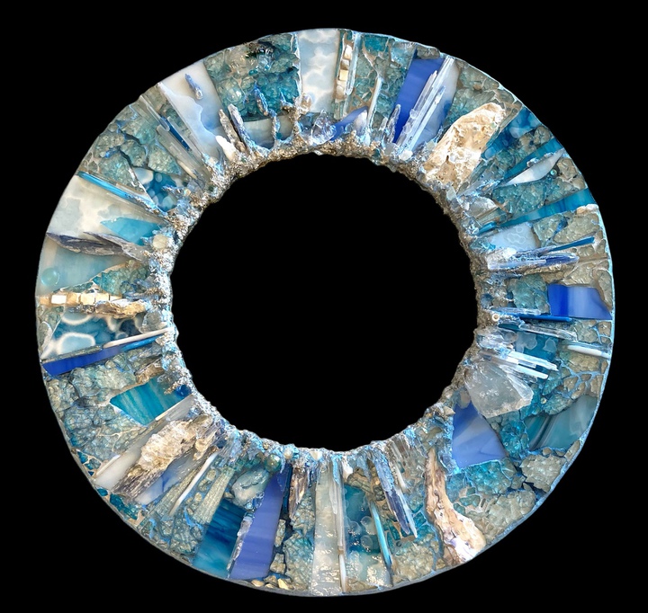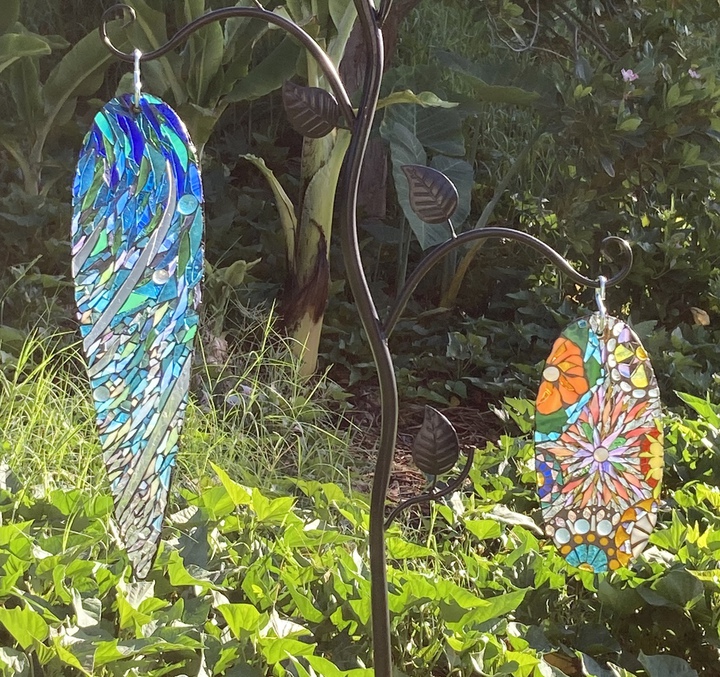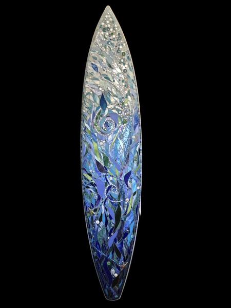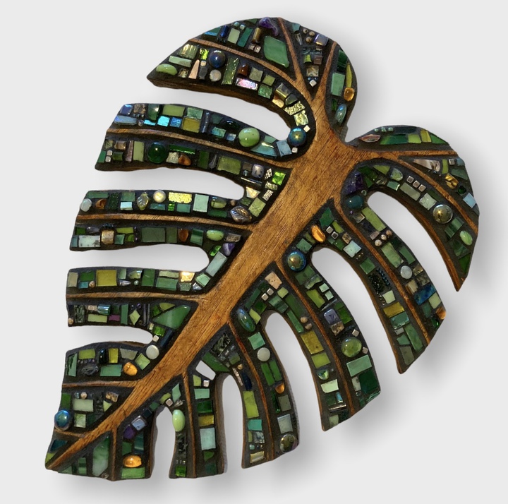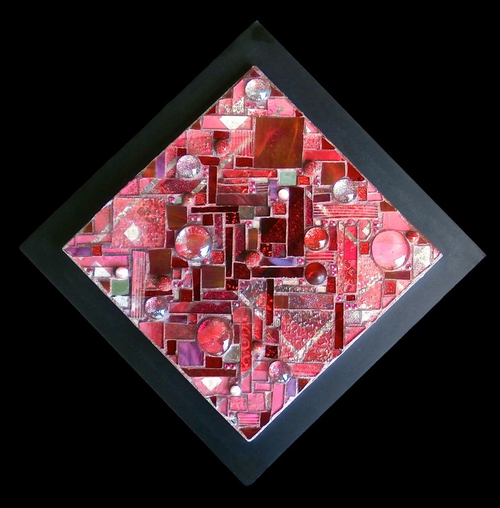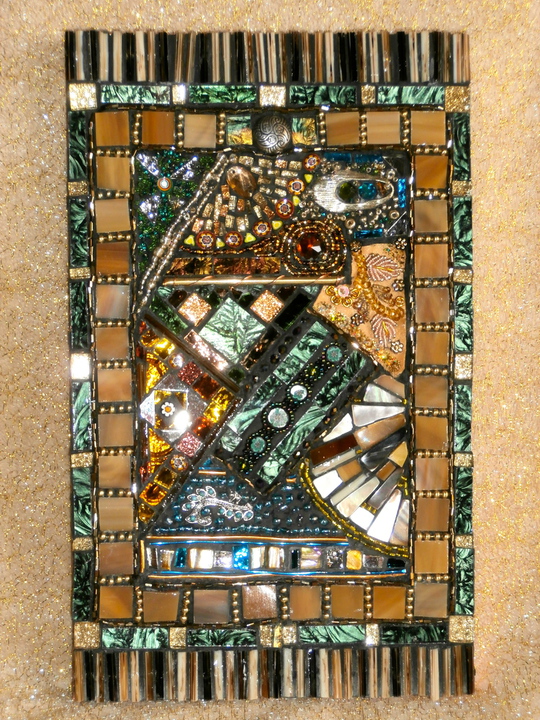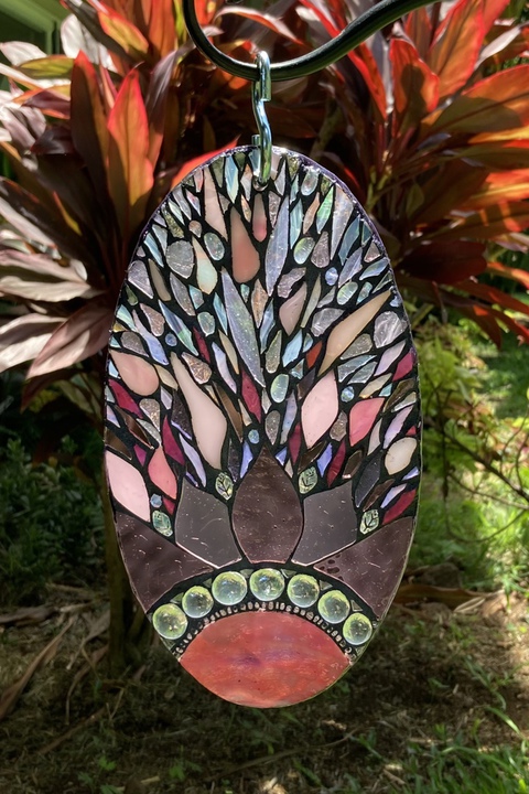 Each mosaic is unique, and is lovingly created in a meticulous process in which different art mediums, industrial strength epoxies, glass, colored grout, and materials such as jewels,